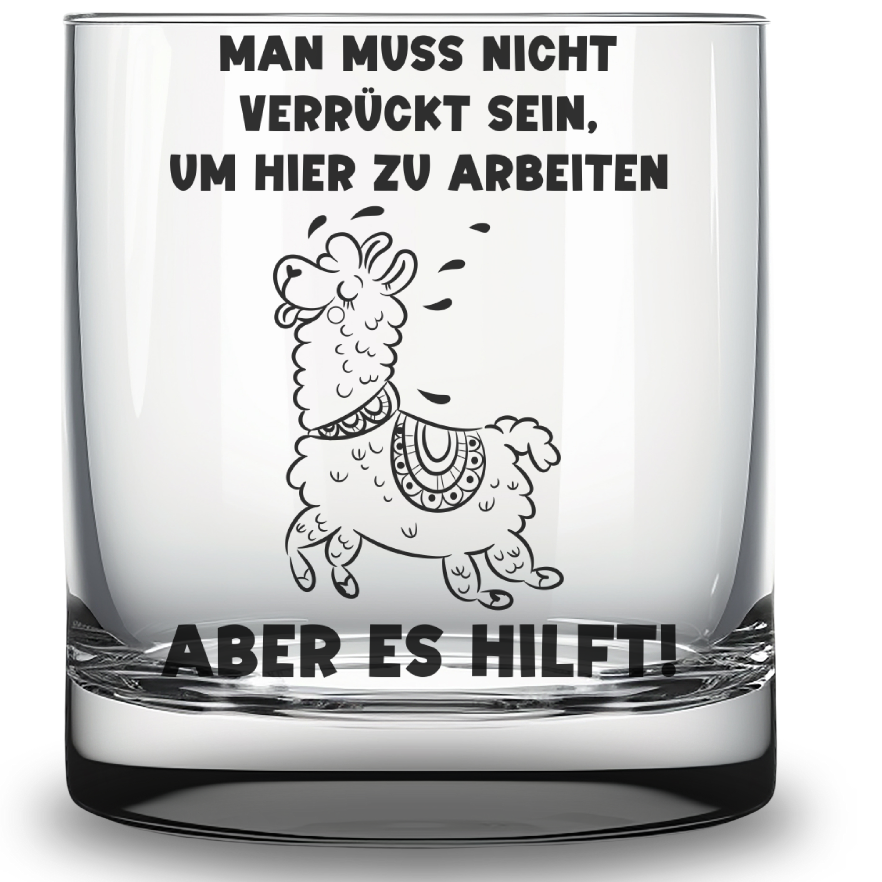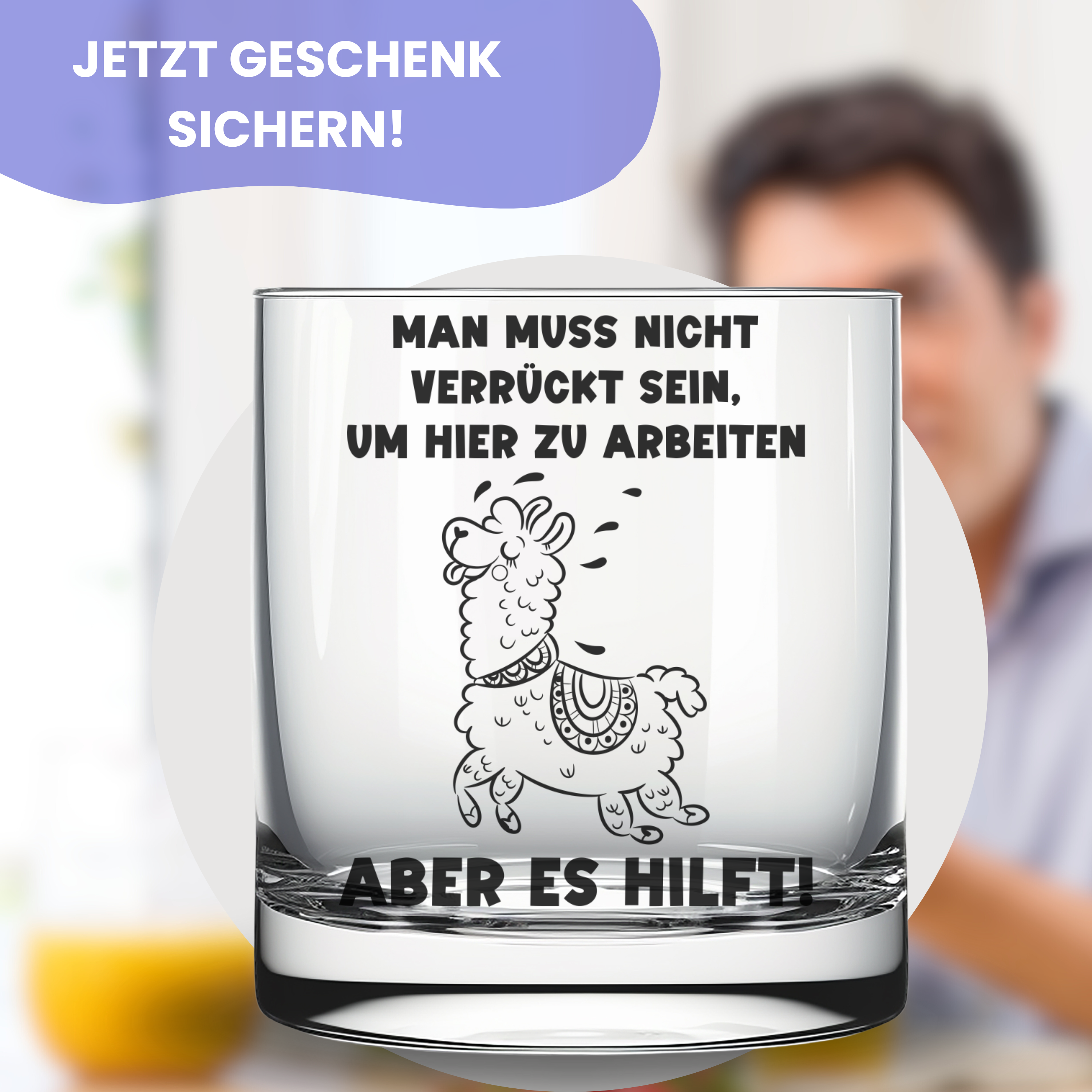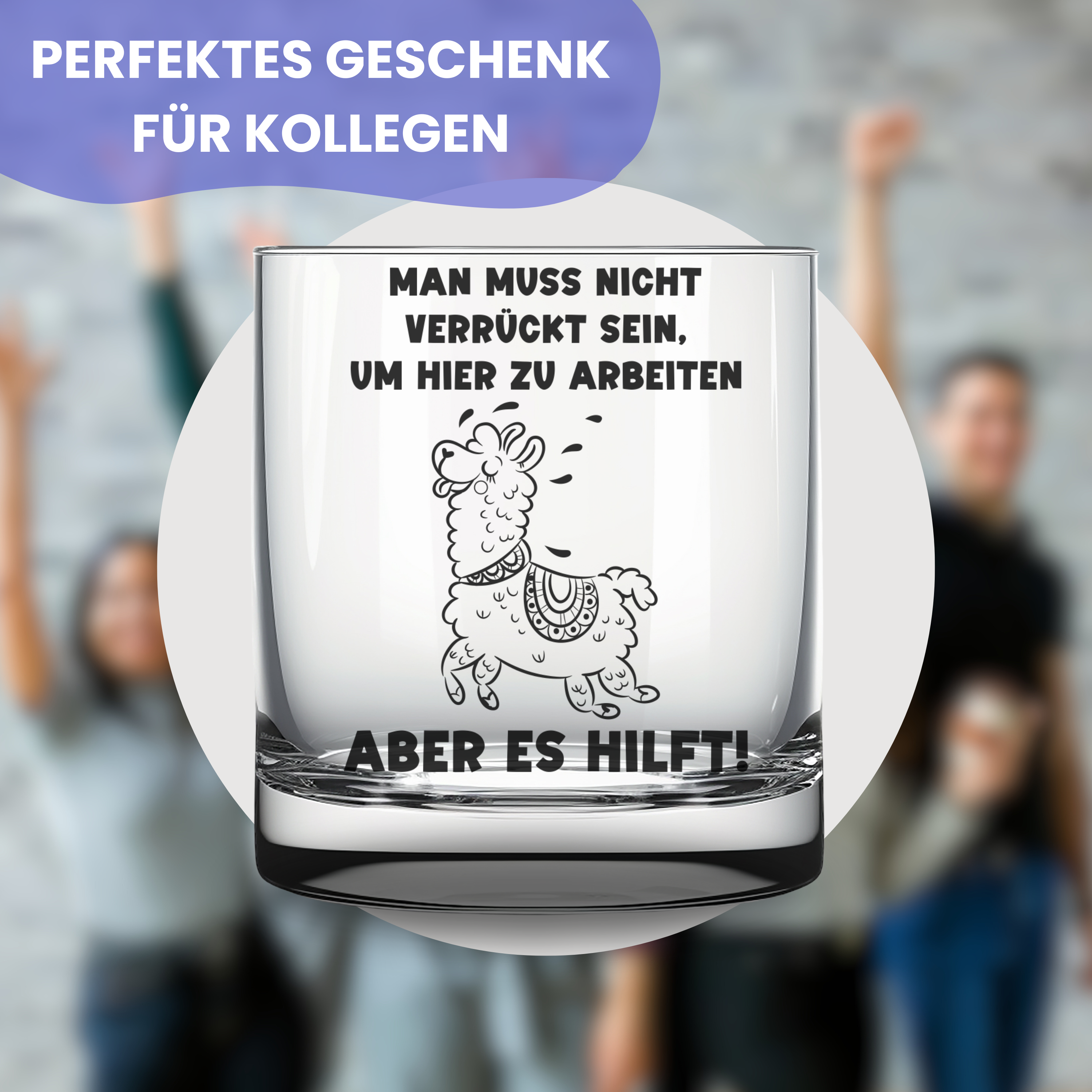 🥃 Witziges Trinkglas mit Gravur "Man muss nicht verrückt sein, um hier zu arbeiten ... aber es hilft" und einem Lama-Motiv. Eine tolle Geschenkidee und kleine Aufmerksamkeit für die geschätzte Kollegin oder den geschätzten Kollegen. Bringen Sie mit diesem Glas ein bisschen Heiterkeit in Ihren Büro- und Arbeitsalltag.