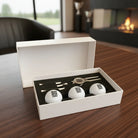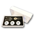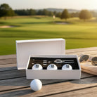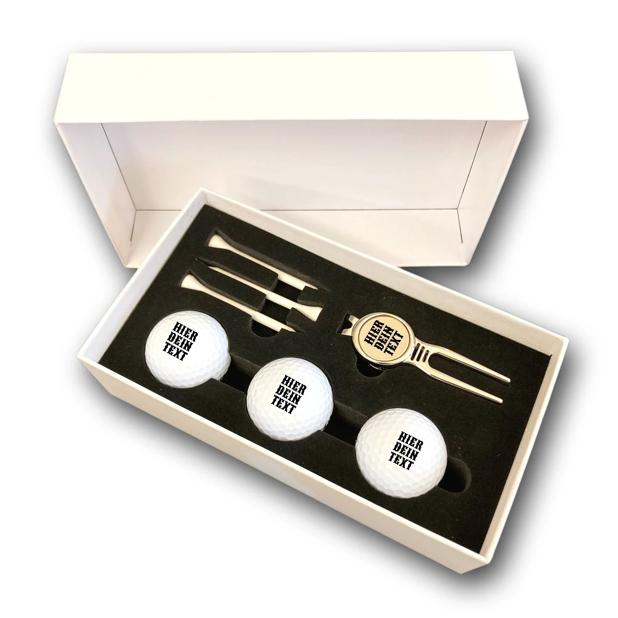 ⛳ Elegantes Golfball Geschenkset bestehend aus 3 mit deinem Wunschtext (Name oder kurzer Text) gravierten Wilson Golfbällen, 1 mit gleichem Text gravierten Pitchgabel und 3 Tees in einer weißen Geschenkschachtel.