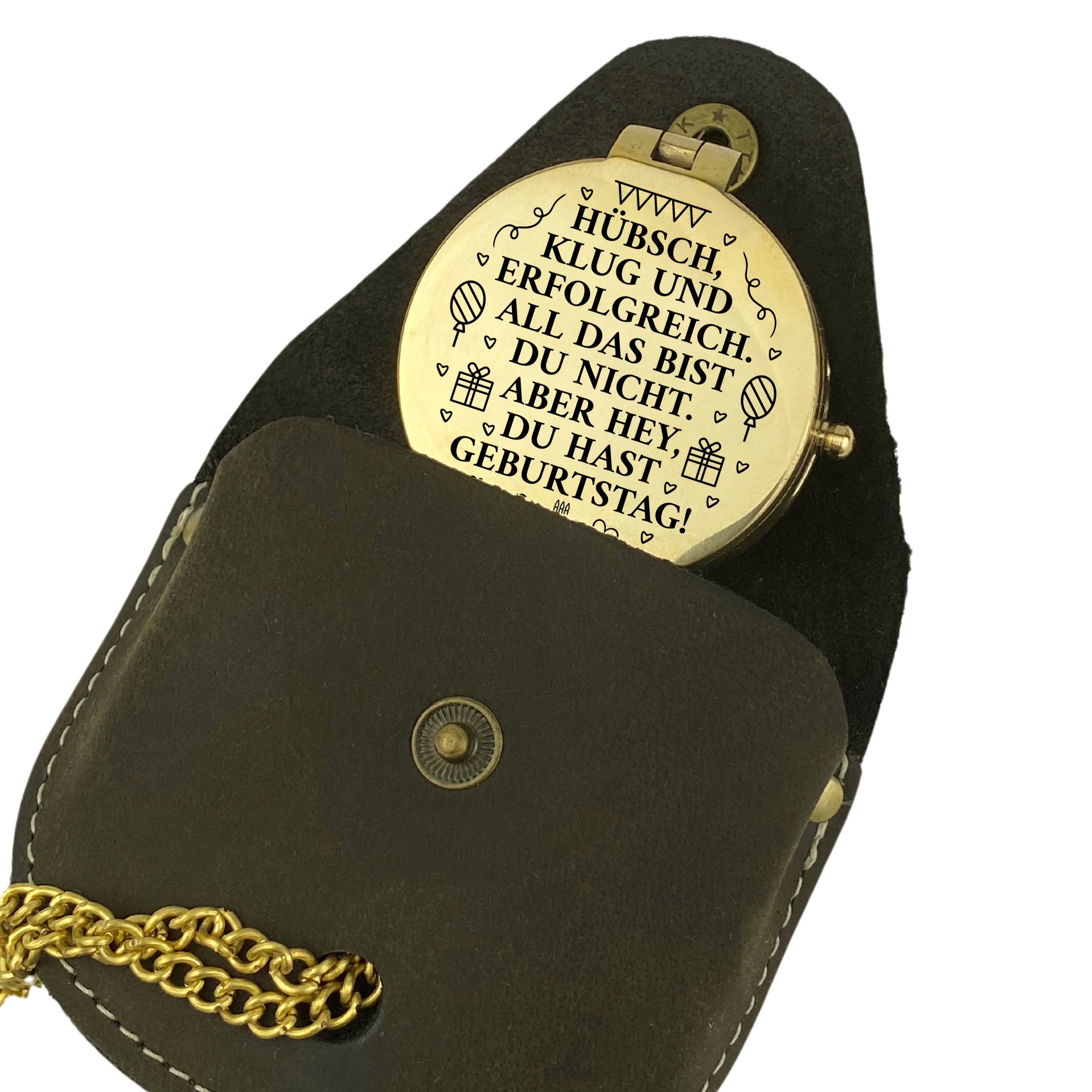 Sehr schön gearbeiteter Kompass mit schönem Lederetui. Der individuelle Text wurde korrekt graviert.Der Kompass wurde zum Abschied eines Kollegen verschenkt und er hatte Tränen in den Augen und fand die Idee sehr schön und besonders.