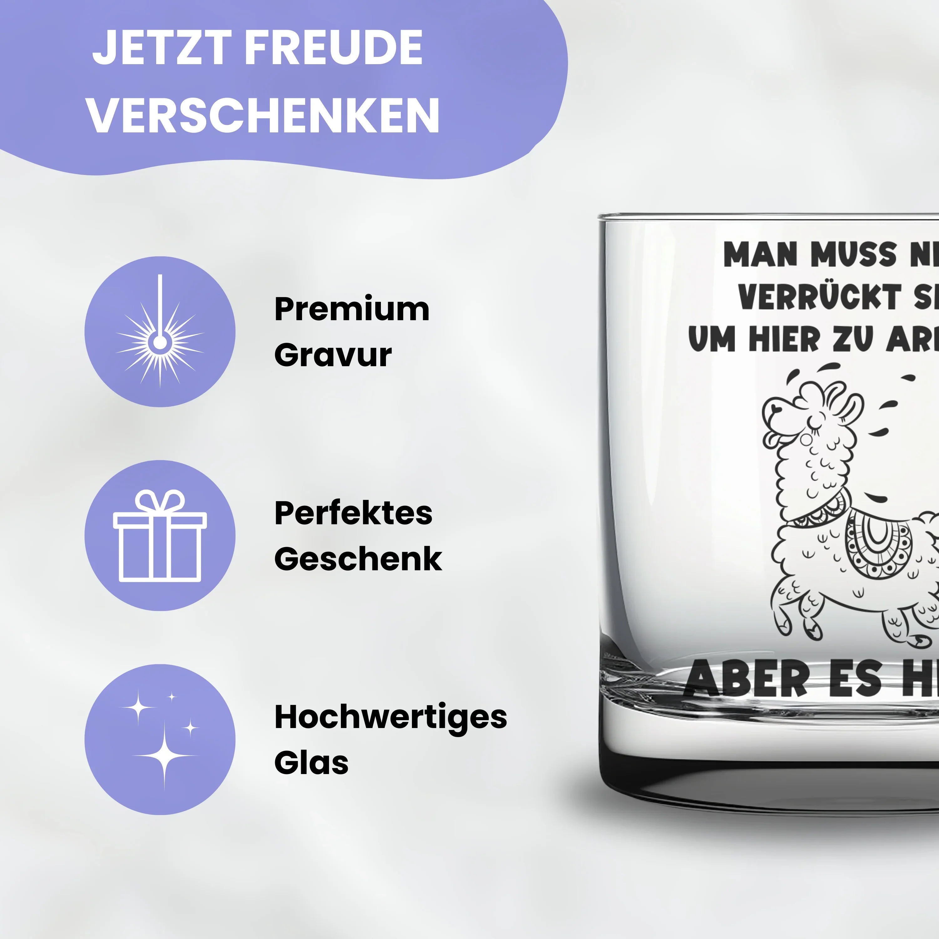 🥃 Witziges Trinkglas mit Gravur "Man muss nicht verrückt sein, um hier zu arbeiten ... aber es hilft" und einem Lama-Motiv. Eine tolle Geschenkidee und kleine Aufmerksamkeit für die geschätzte Kollegin oder den geschätzten Kollegen. Bringen Sie mit diesem Glas ein bisschen Heiterkeit in Ihren Büro- und Arbeitsalltag.