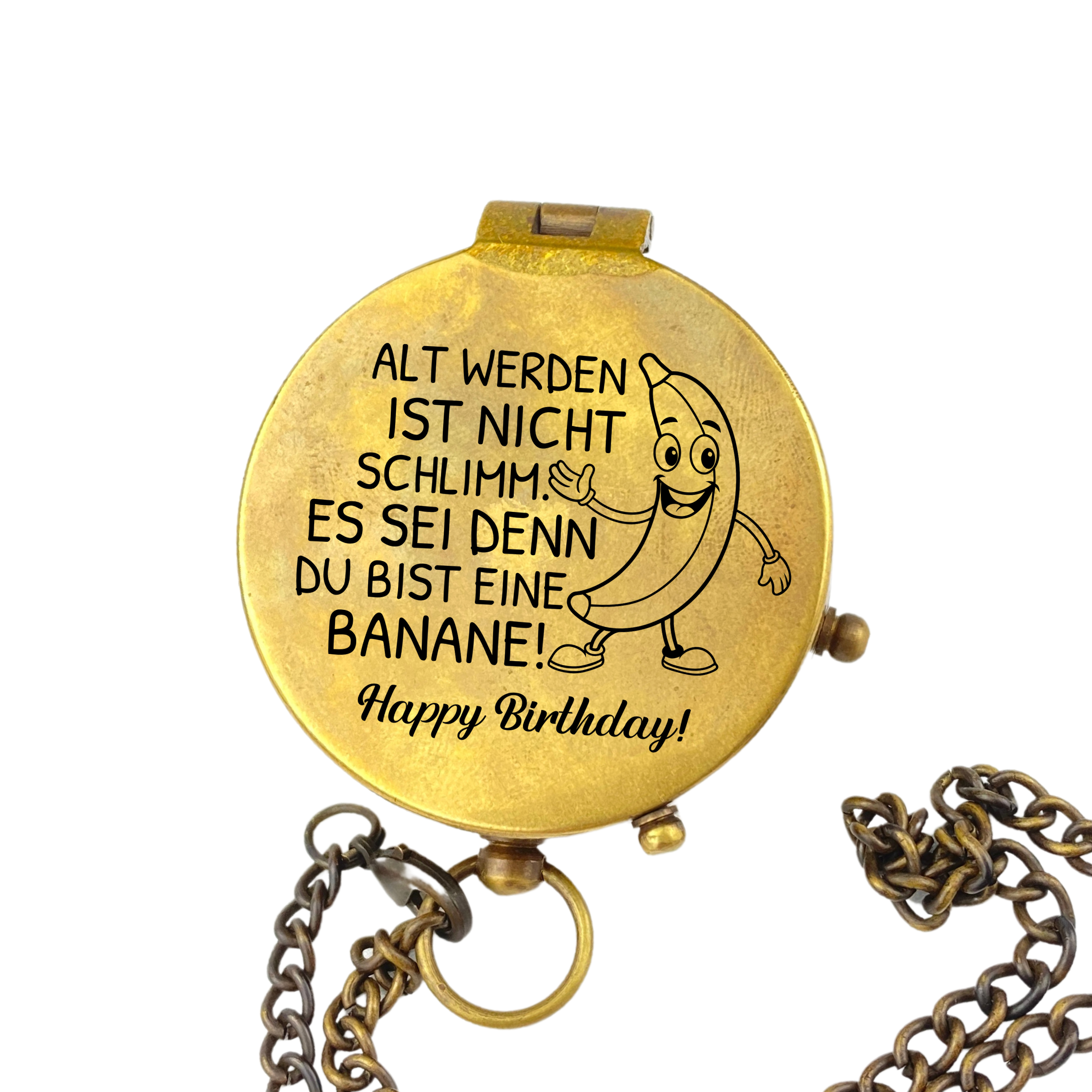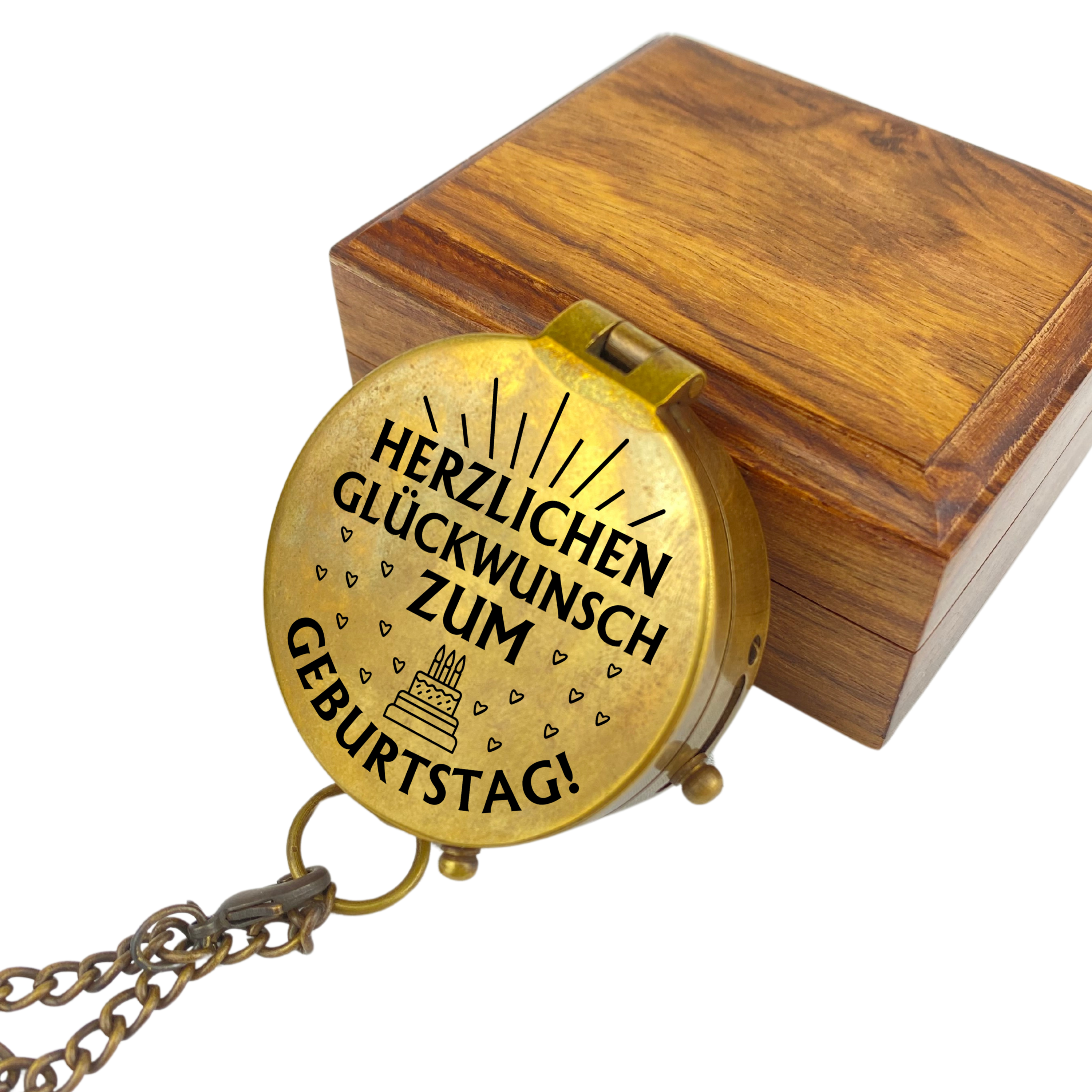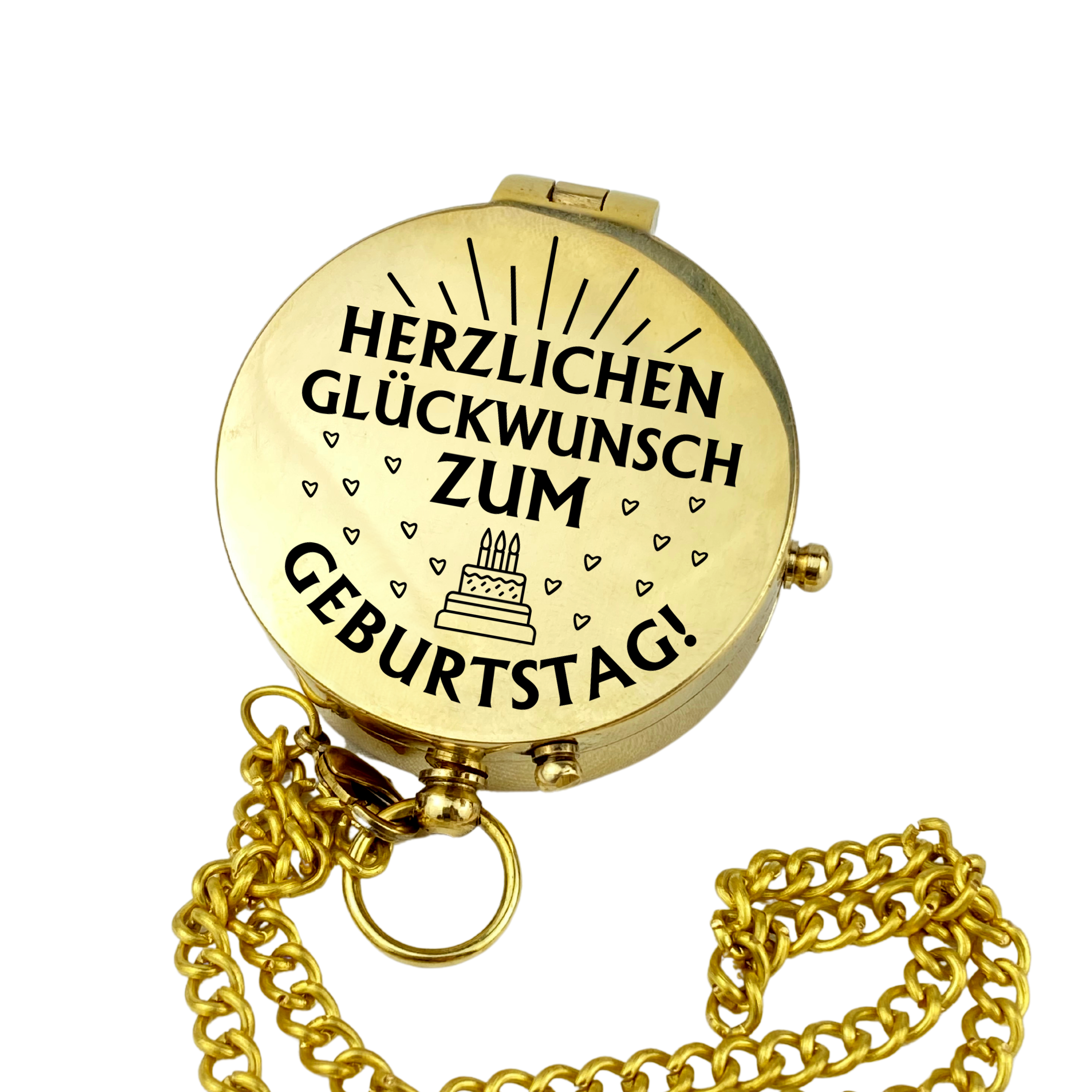 • 🧭Kompass aus Messing (poliert oder in Vintage Optik) an einer Kette mit Gravur eines anpassbaren Geburtstags-Motives auf dem Deckel und zusĂ€tzlich Ihrem persönlichen Wunschtext auf der Innenseite des Deckels (optional).