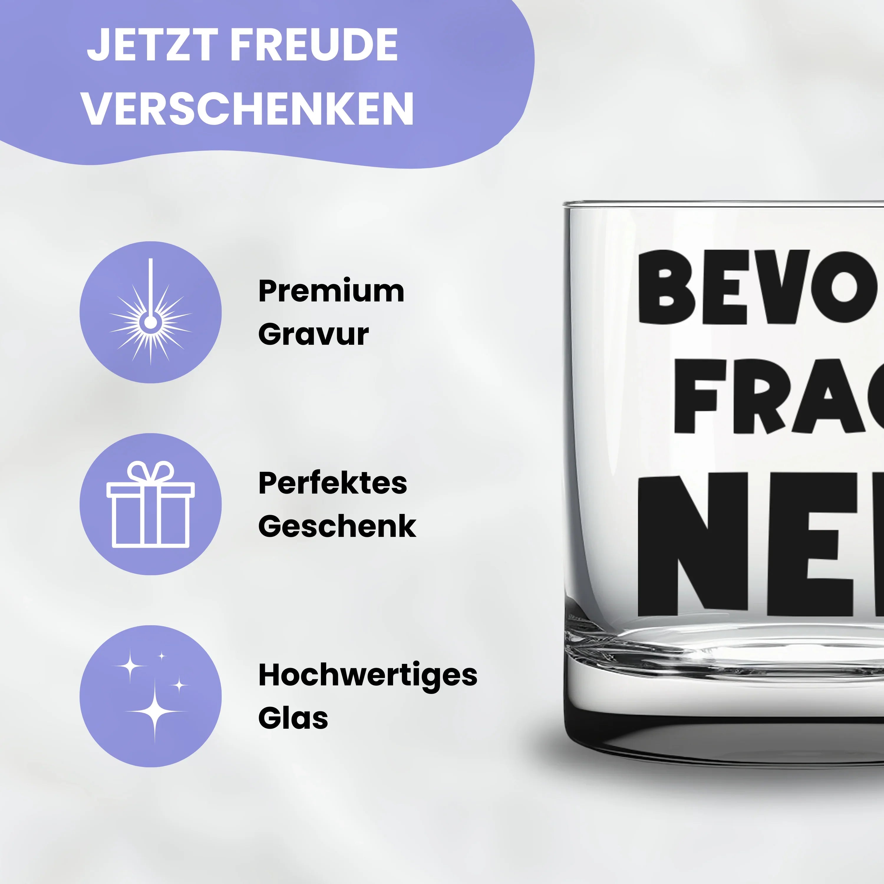 đ„ Ein Glas sagt mehr als tausend Worte! Witziges Trinkglas mit Gravur "Bevor du fragst: NEIN!". Eine tolle Geschenkidee und kleine Aufmerksamkeit fĂŒr die Kollegen im BĂŒro und bei der Arbeit, die Freunde oder auch den Partner zuhause. Bringen Sie mit diesem Glas ein bisschen Heiterkeit in Ihren Alltag.
