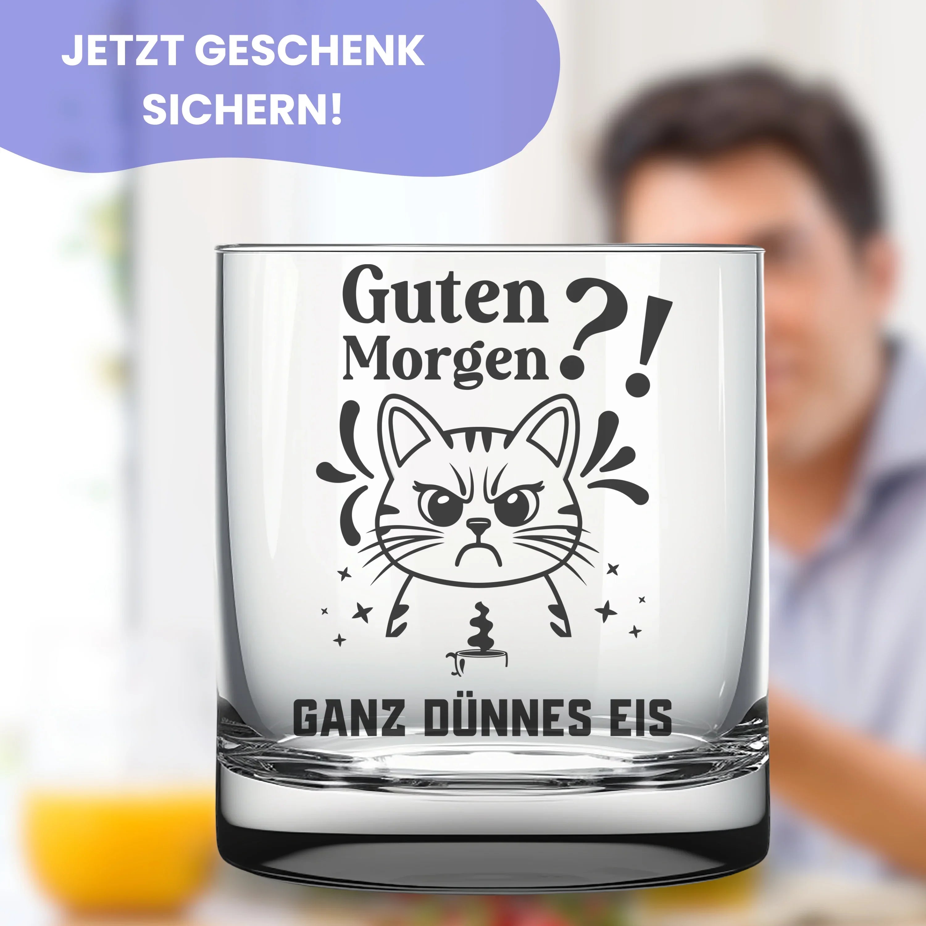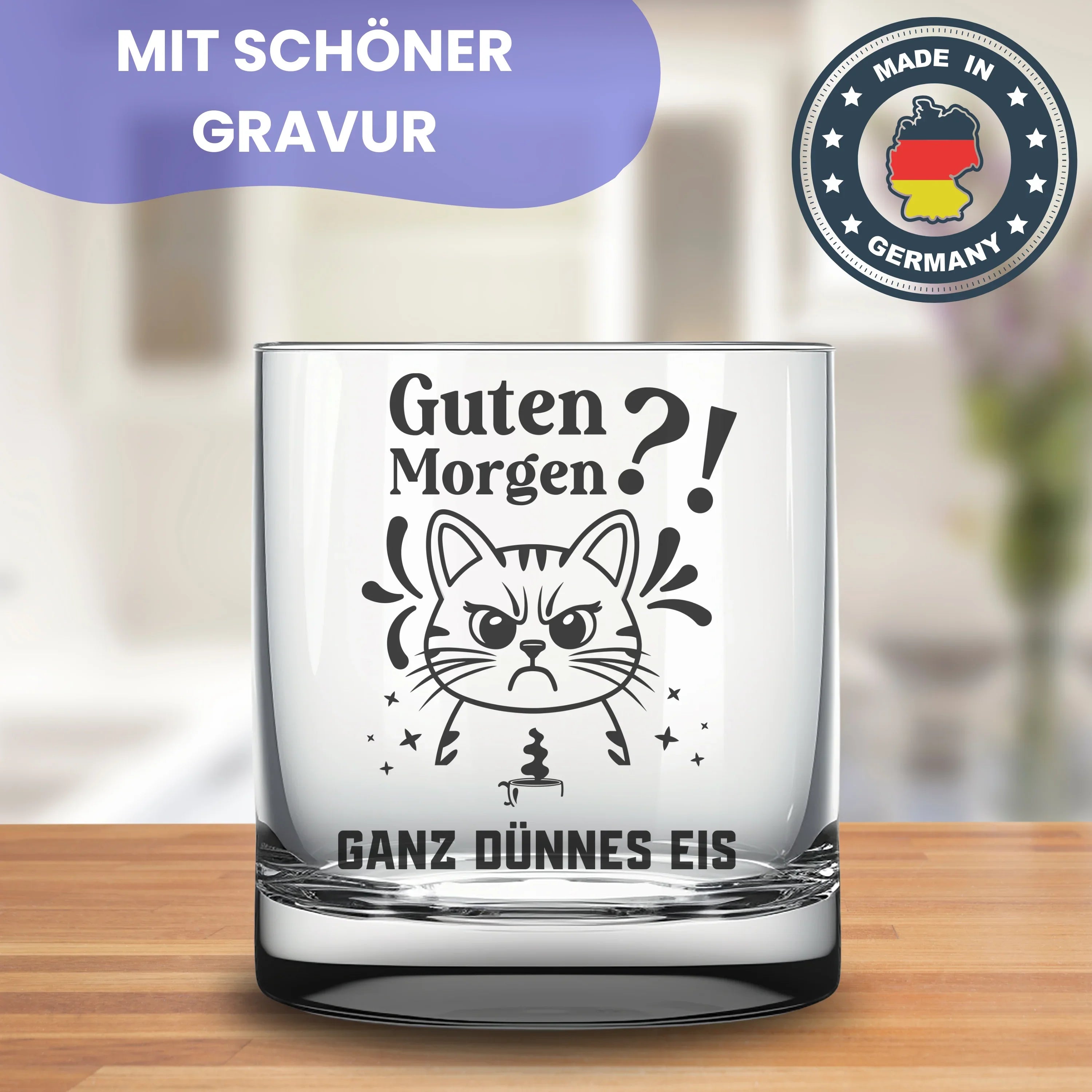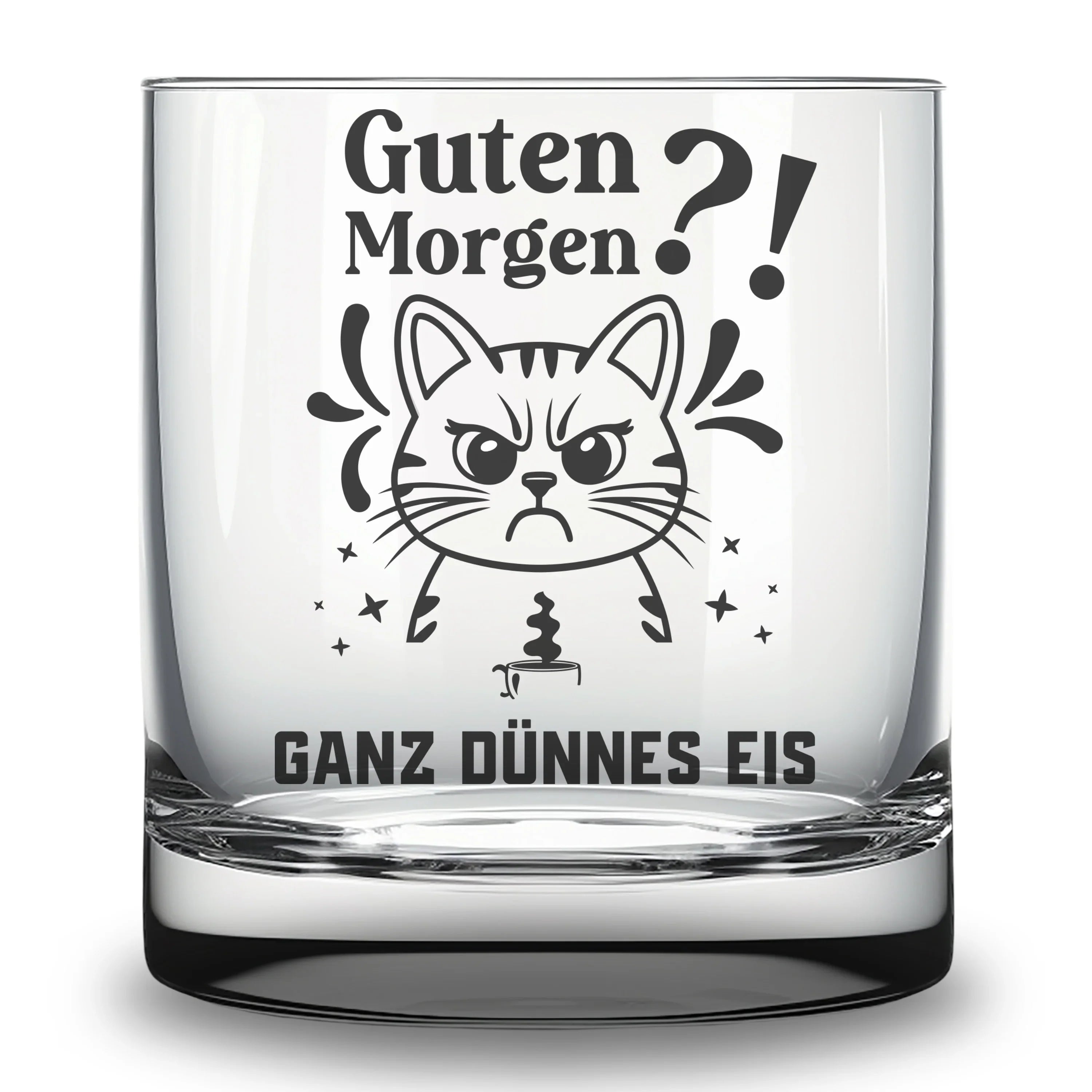 🥃 Witziges Trinkglas mit Gravur "Guten Morgen?! Ganz dünnes Eis" und einem Katzen-Motiv. Eine tolle Geschenkidee für alle Morgenmuffel, den Partner, die Freundin, den Freund oder einen geschätzten Kollegen.