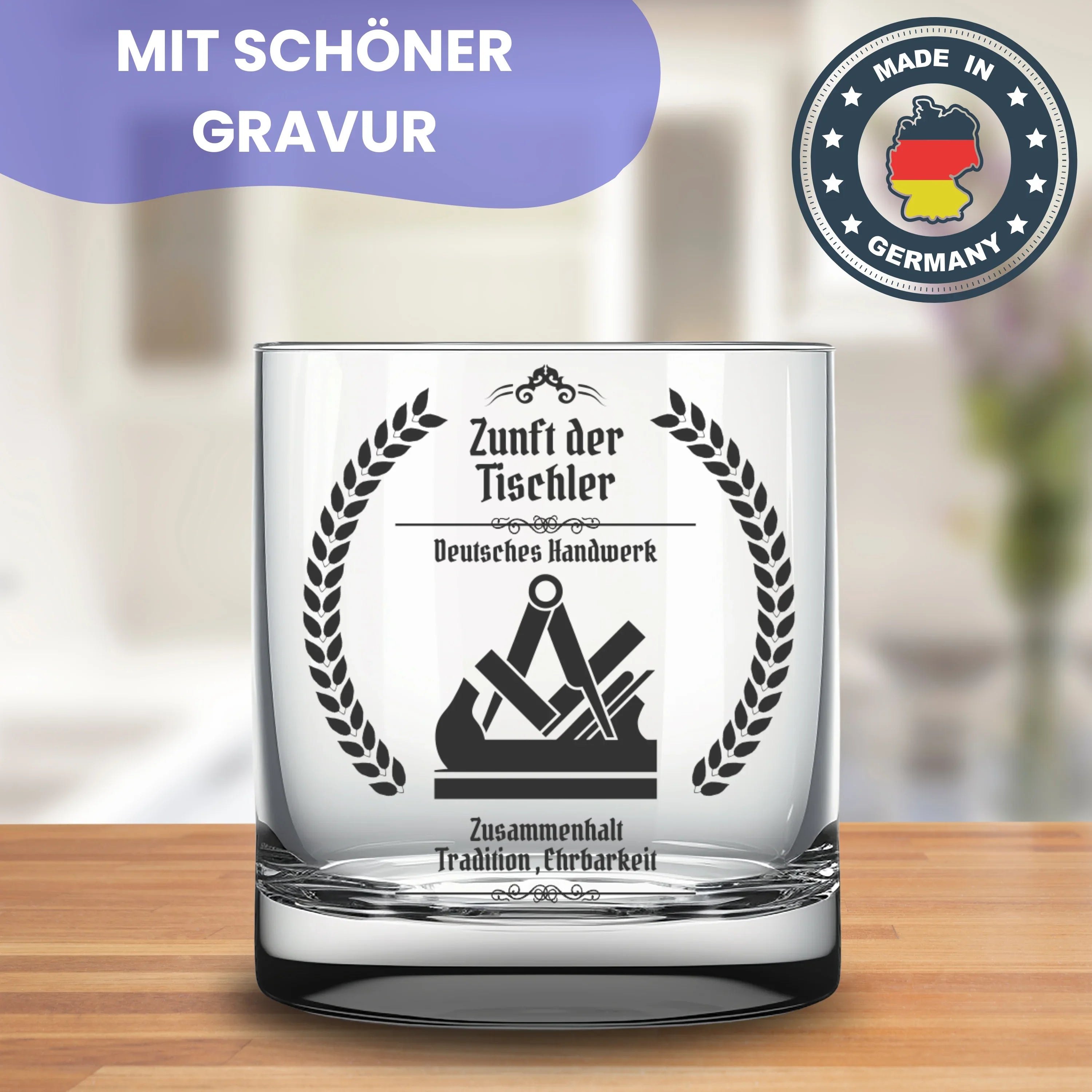 🥃 Trinkglas mit Gravur Zunftzeichen der Tischler. Eine tolle Geschenkidee und kleine Aufmerksamkeit für alle Tischler und Schreiner, bei der Arbeit, im Kollegen- und Freundeskreis.