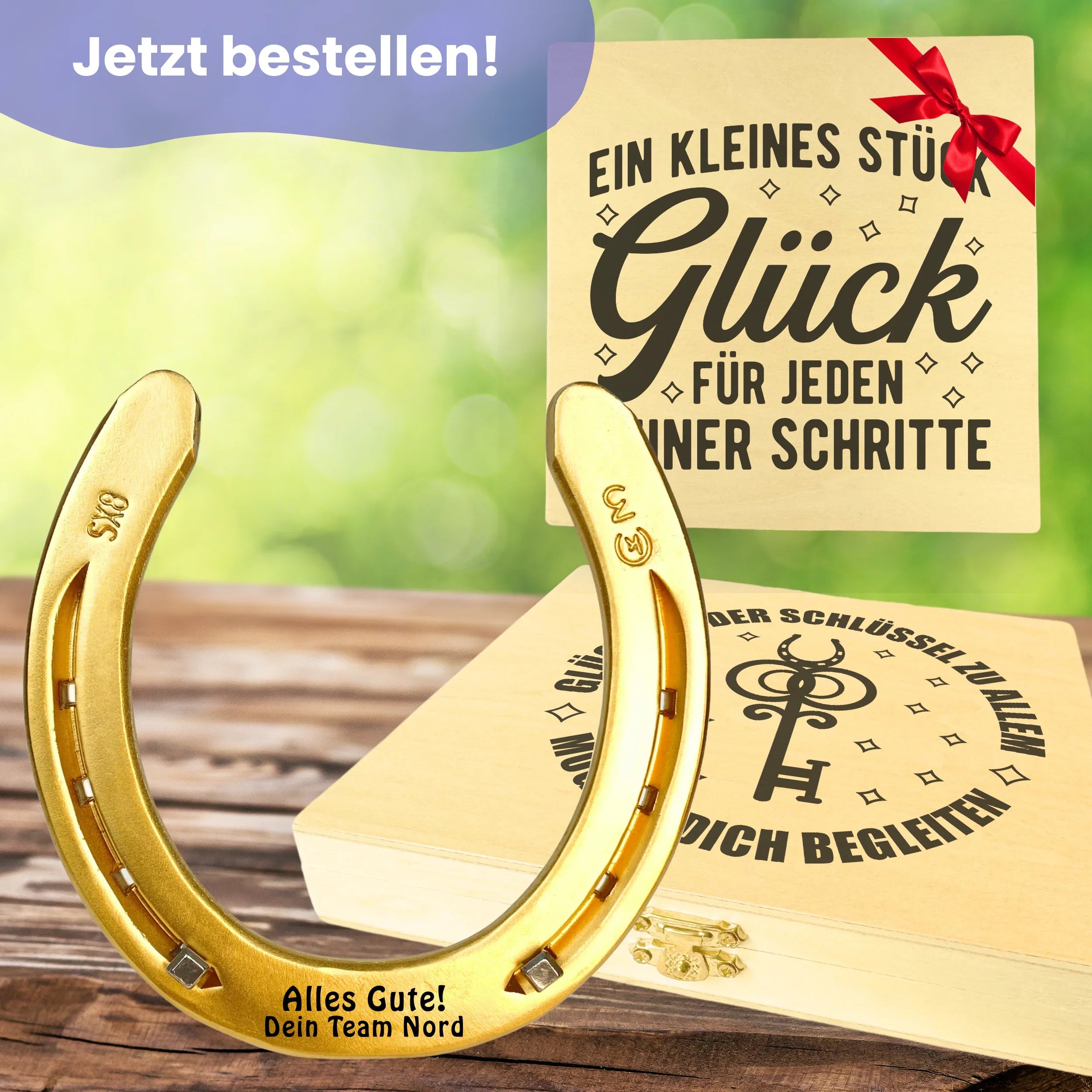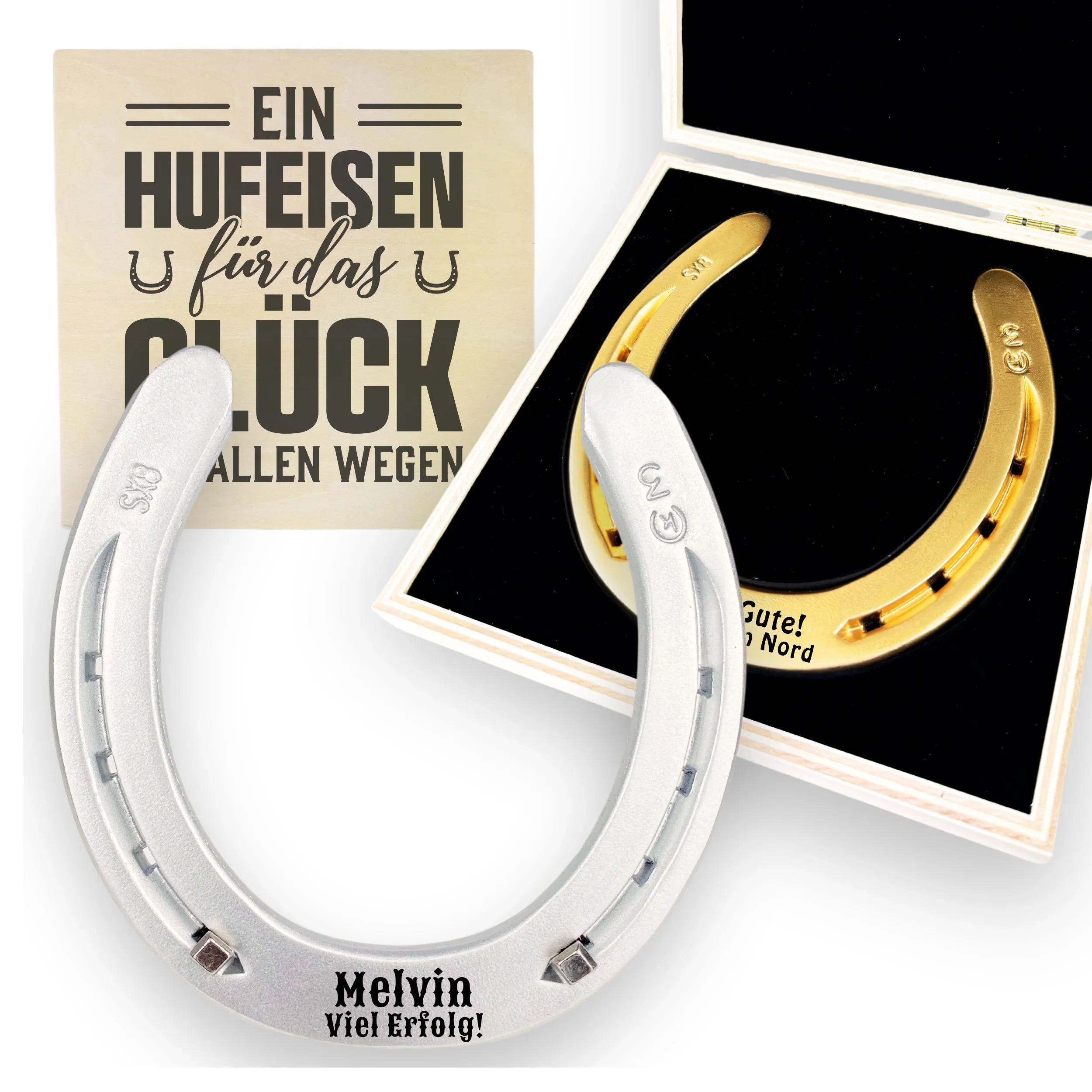 Hufeisen GLÜCK aus schwerem Eisen Glücksbringer in gold oder silber mit Geschenkbox aus Holz mit persönlicher Gravur