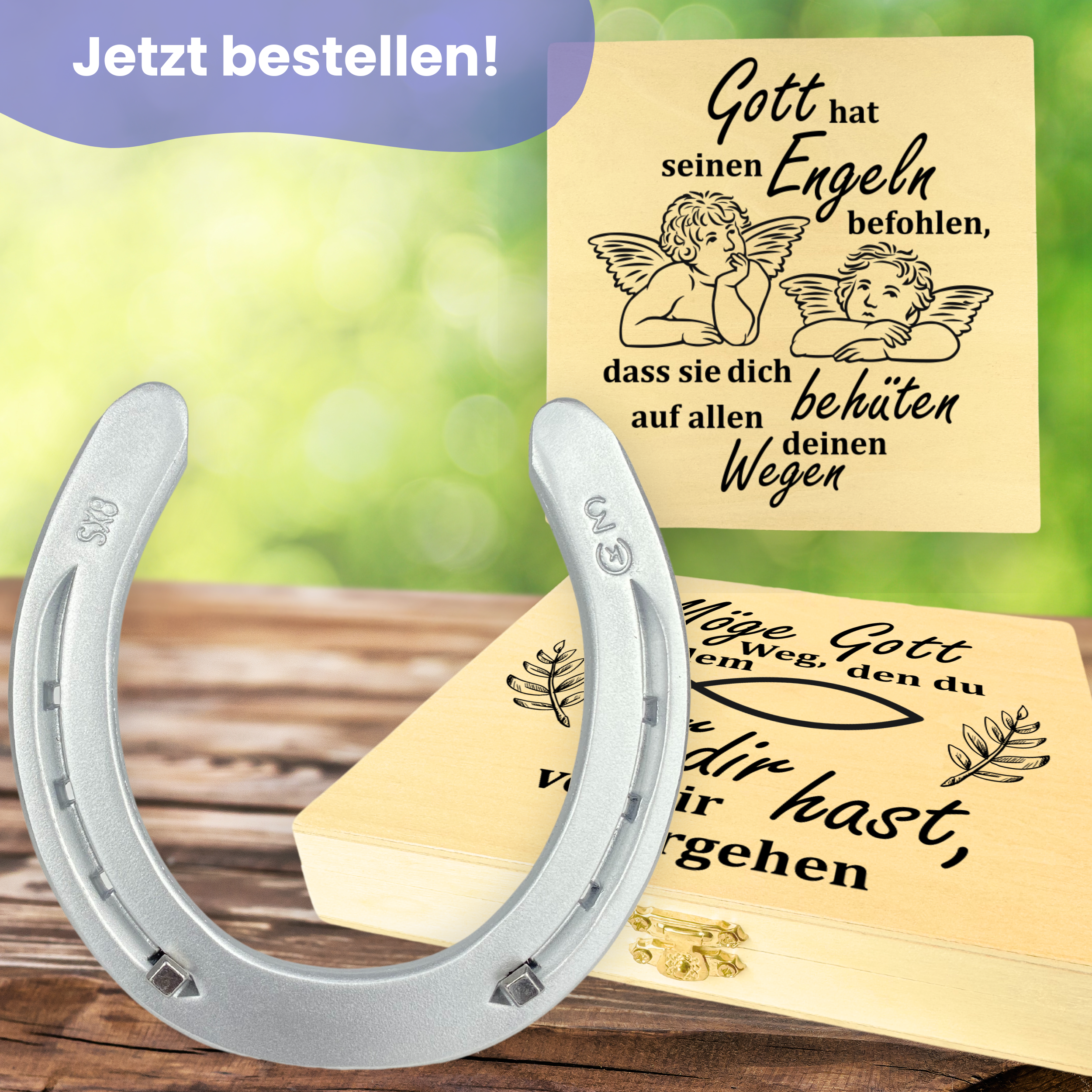 - 🪵 Elegante Geschenkbox aus Holz: Verleiht dem Geschenk einen natürlichen, hochwertigen Look und schützt das Hufeisen ideal. Abgerundet mit einer hochwertigen Lasergravur
