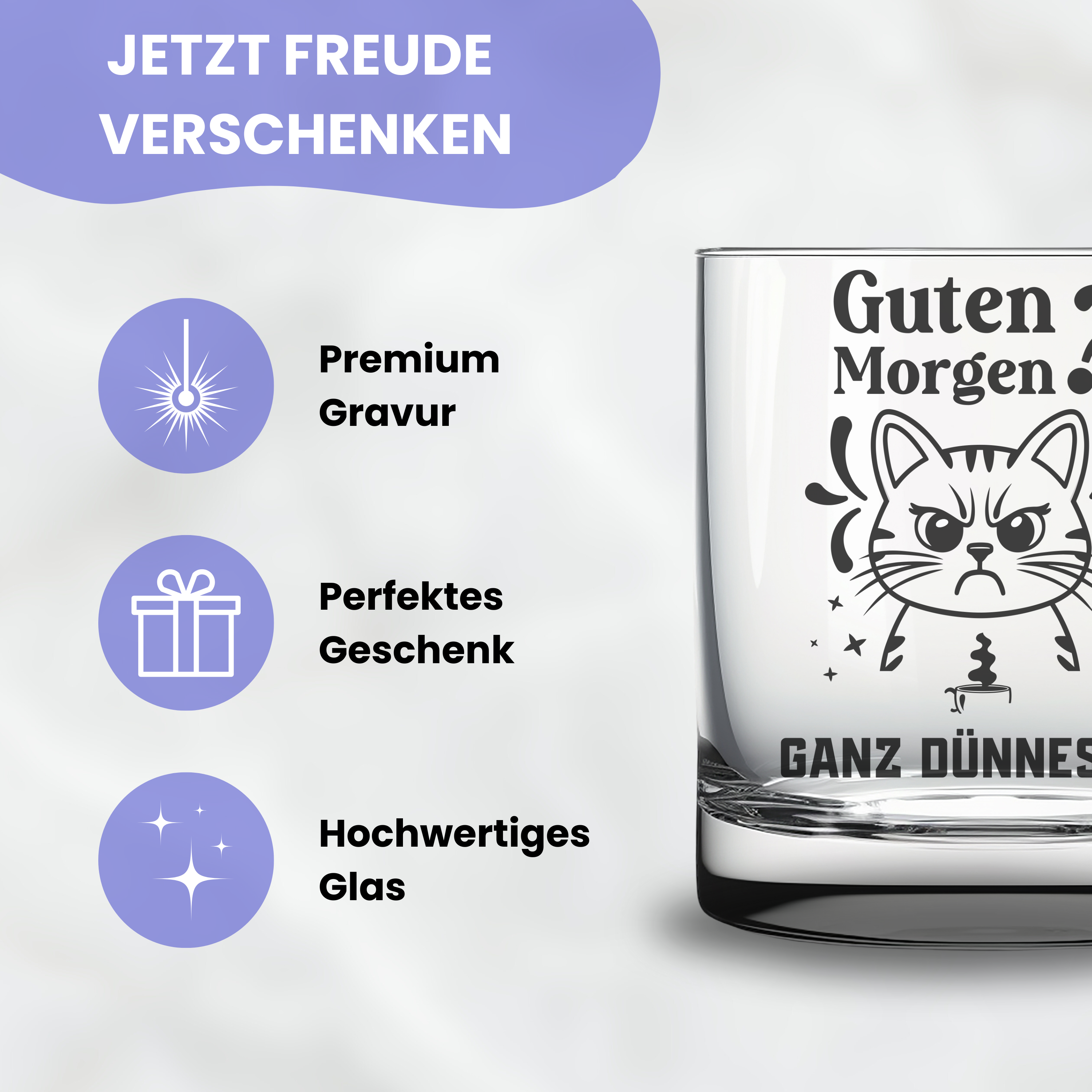 🥃 Witziges Trinkglas mit Gravur "Guten Morgen?! Ganz dünnes Eis" und einem Katzen-Motiv. Eine tolle Geschenkidee für alle Morgenmuffel, den Partner, die Freundin, den Freund oder einen geschätzten Kollegen.